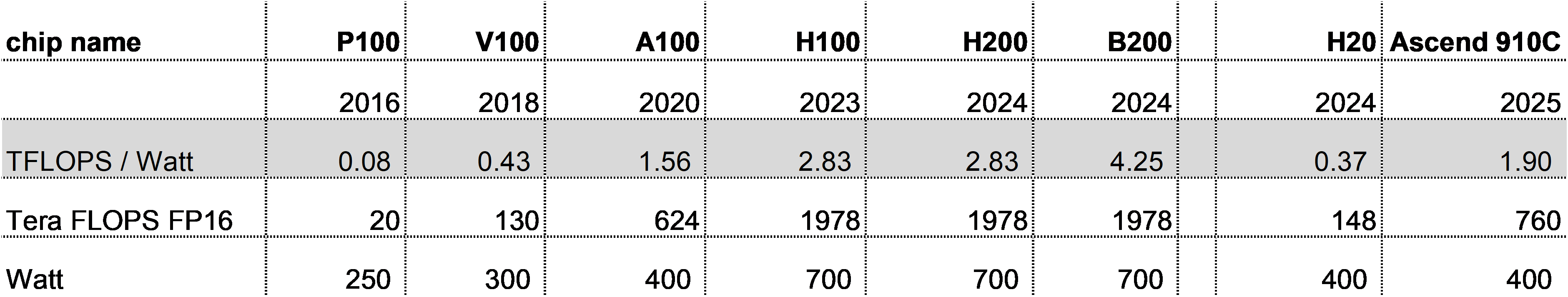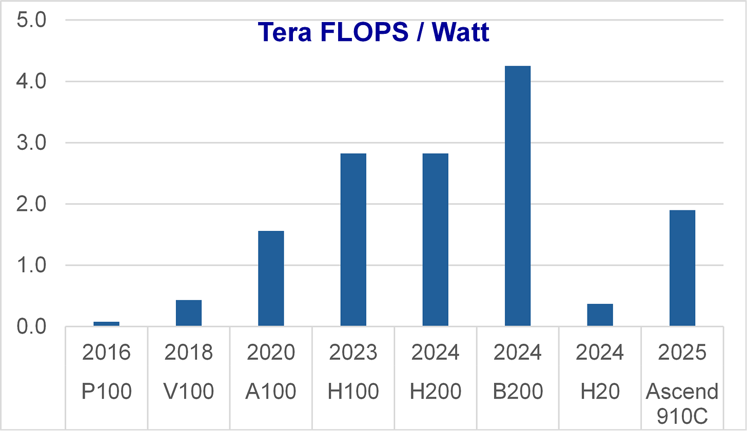 Let’s use the little bit of data published by western websites on the chip. The “best” Chinese source is here and you’ll see there is very little on performance / specs. Let’s look at the efficiency of the chip: how much calculations do you get per Watt of electricity? Here is a comparison of Nvidia’s data center GPUs and Ascend 910C.