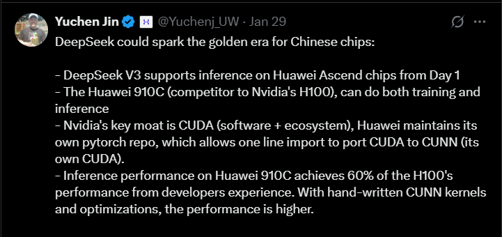 You’ll find some reports like this one and this one that mention that the evaluation of Ascend 910C was done by DeepSeek by a certain Mr. Yuchen JIN. Mr. JIN says he is the co-founder and CTO of Hyperbolic Labs, no association with DeepSeek on his bio. He has a very busy X page which shows this 1 single tweet: