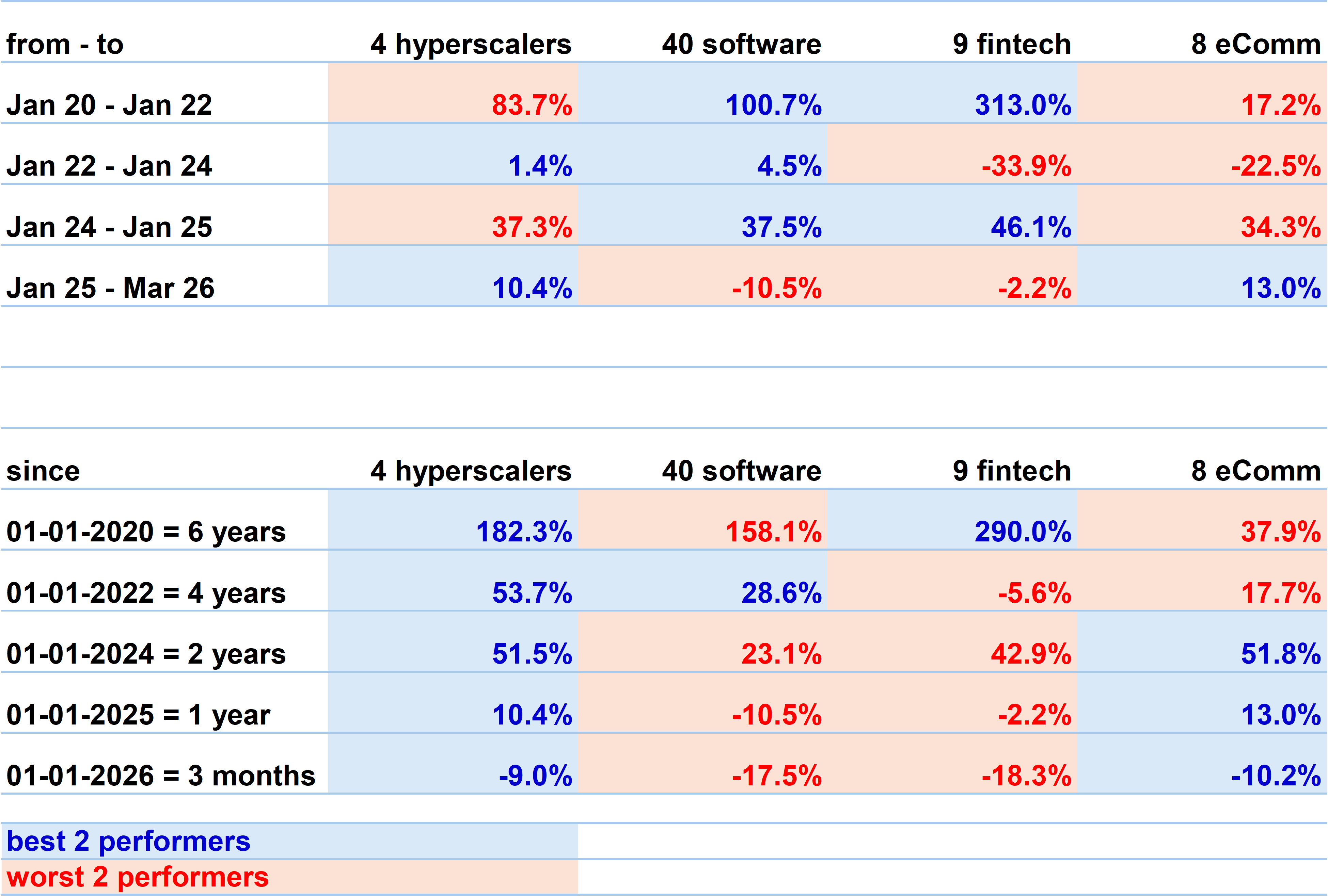 But no. Over different time frames, up to last Friday 13 March ’26, Hyperscalers consistently outperform. Not absolutely outperform, as Fintech or eComm had 1-2 periods of best outperformance. But if you’re a risk-adverse and lazy investor (i.e. that’s me), Hyperscalers have delivered the most consistent outperformance for the lowest volatility.
