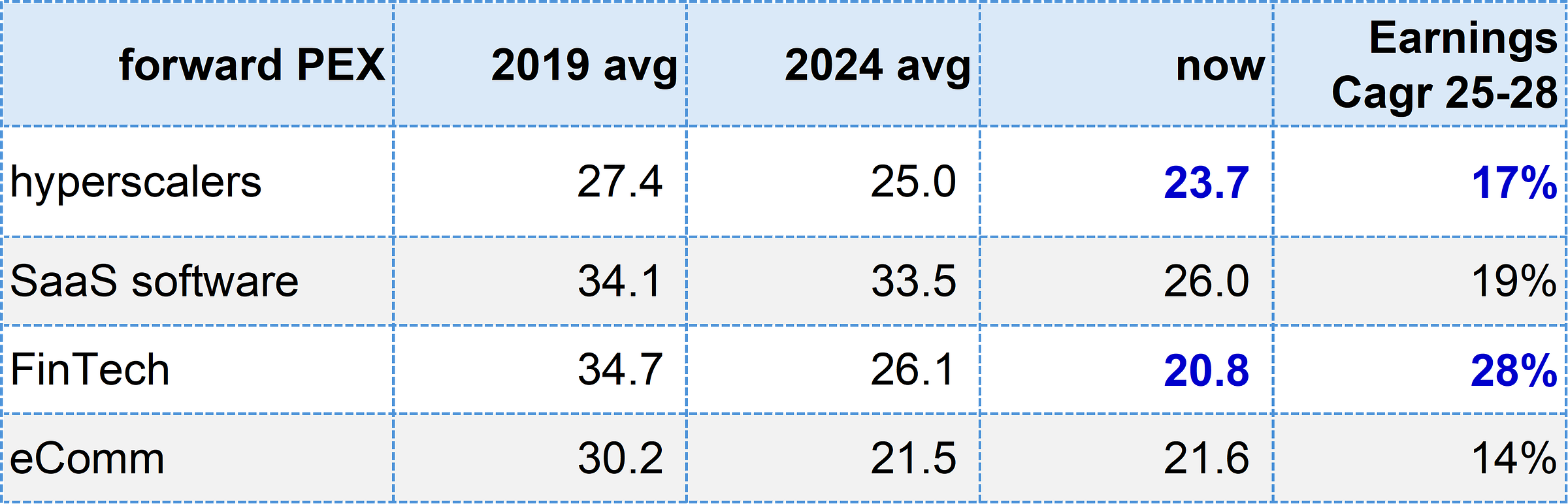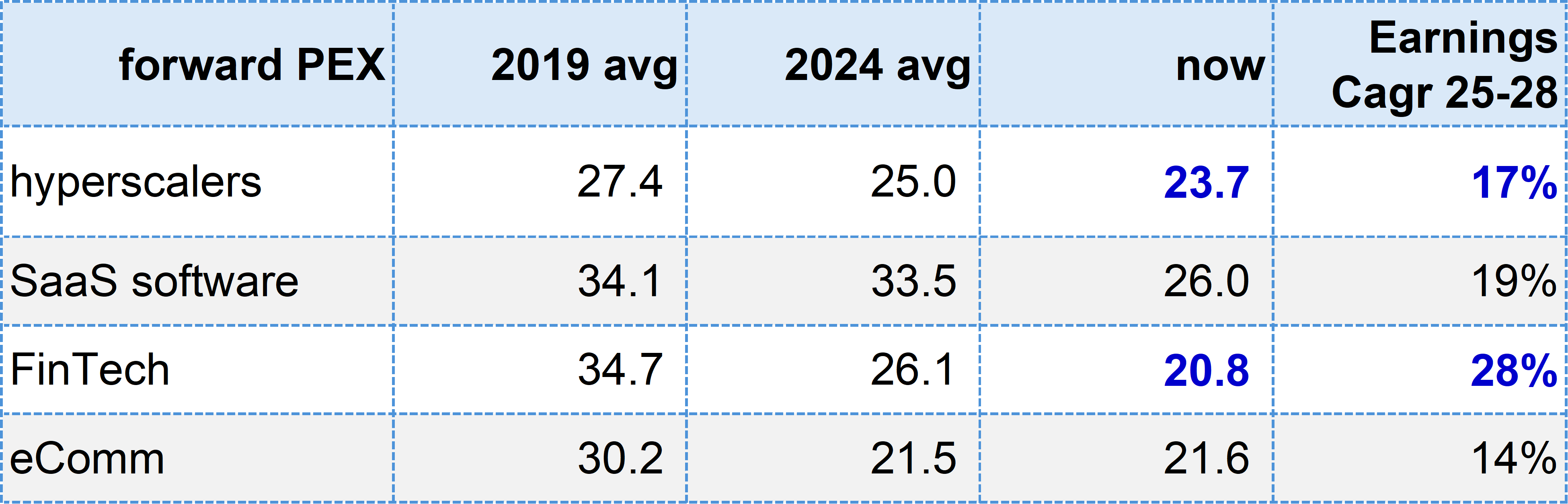 De-rating, but not cheap. Hyperscalers and some Fintech more interesting.