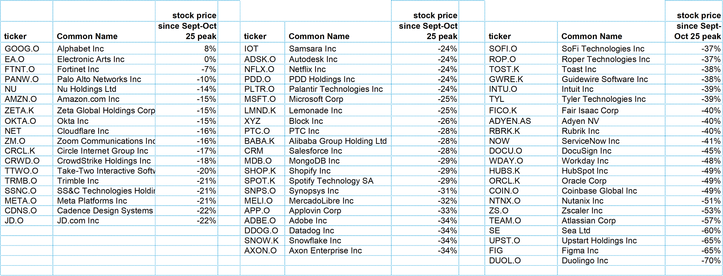 If you want to look at the valuations, growth per stock, that’s the last table at the end. Stock performance from Sept / Oct ’25 peak to last Friday here: